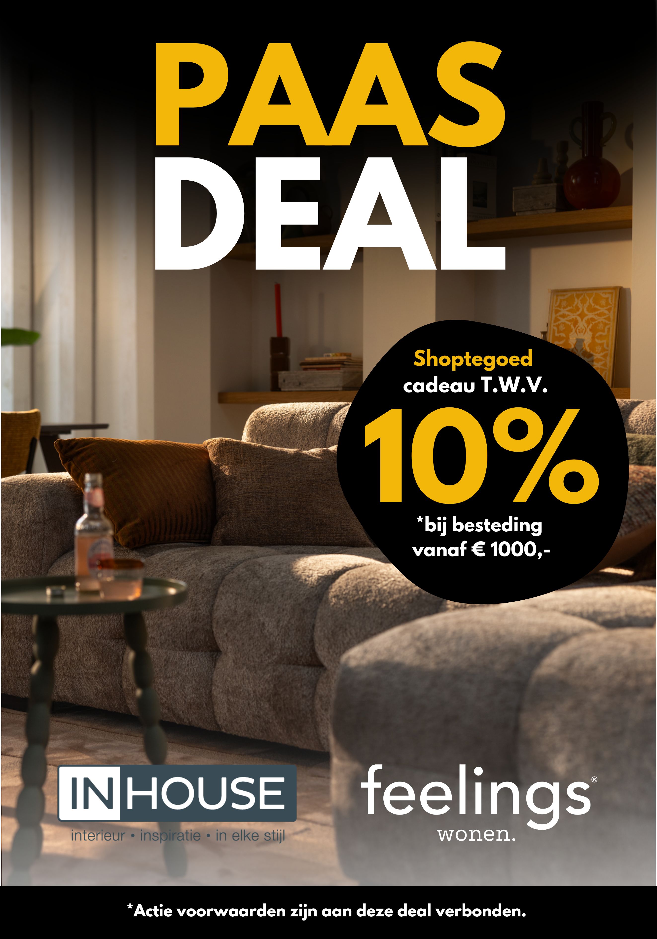 Van 20 maart t/m 13 april 2026 ontvang je een INHOUSE & Feelings Wonen cadeaucheque t.w.v 10% van je aankoopbedrag bij een besteding vanaf €1000,-. Deze cadeaucheque is uitsluitend te besteden in onze INHOUSE & Feelings Wonen winkel in Hellevoetsluis. Hoe hoger het aankoopbedrag, hoe hoger de waarde van jouw shoptegoed!